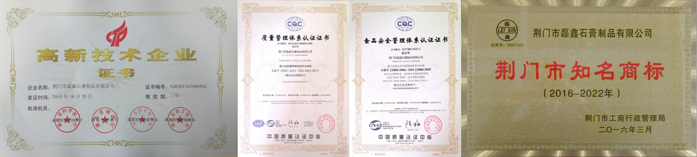 國家高新技術(shù)企業(yè)!湖北省專精特新中小企業(yè)!湖北省支柱產(chǎn)業(yè)細(xì)分領(lǐng)域隱形冠軍培育企業(yè)!湖北省守合同重信用企業(yè)!湖北省兩化融合示范企業(yè)!荊門市知名商標(biāo)!中國高純、高白、高亮、超細(xì)硫酸鈣(石膏)生產(chǎn)基地!中國取得《食品生產(chǎn)許可證》的食品添加劑硫酸鈣(石膏)供應(yīng)商!中國取得《飼料添加劑生產(chǎn)許可證》和《產(chǎn)品批準(zhǔn)文號》硫酸鈣供應(yīng)商!中國取得《出口飼料生產(chǎn)、加工、存放企業(yè)檢驗(yàn)檢疫注冊登記證》飼料添加劑硫酸鈣供應(yīng)商!通過ISO9001國際質(zhì)量管理體系認(rèn)證!通過ISO22000國際食品安全管理體系認(rèn)證!通過HALAL國際清真認(rèn)證!通過KOSHER猶太認(rèn)證! 荊門市磊鑫石膏制品有限公司成立于2002年,位于石膏資源富集的湖北省荊門市東寶區(qū)工業(yè)園幸福路,占地27000余平方米,是一家在業(yè)內(nèi)享有盛譽(yù)的集石膏、石膏粉和硫酸鈣制品研發(fā)、生產(chǎn)、銷售于一體的高新技術(shù)企業(yè)。公司擁有 “磊鑫”、“杰普生”、“凱氏蘇特”等5個(gè)國家注冊商標(biāo),2個(gè)發(fā)明專利,18個(gè)實(shí)用新型專利,50余篇自有技術(shù)應(yīng)用研究,36篇權(quán)威期刊發(fā)表技術(shù)論文。主要產(chǎn)品有:醫(yī)藥級硫酸鈣、食品級硫酸鈣、飼料添加劑硫酸鈣、人造石透明填充粉,凱色粉、涂料及化妝品功能性填料和特級半水纖膏粉、混合石膏粉、模型石膏粉,建筑石膏粉等九大系列50余種產(chǎn)品。公司享有自營進(jìn)出口權(quán),客戶遍布全世界,是多家公司、集團(tuán)和世界500強(qiáng)企業(yè)的優(yōu)秀供應(yīng)商!產(chǎn)品遠(yuǎn)銷到韓國、日本、俄羅斯、中國臺灣、東南亞、歐美、中東、非洲等國家和地區(qū)。公司緊靠207國道,焦柳鐵路穿境而過,距漢江碼頭50公里,長江沙市港90公里。交通運(yùn)輸便利,確保及時(shí)供貨。“待用戶為上帝誠信為本,視質(zhì)量為生命持之以恒!”是我們的企業(yè)宗旨,與我們合作是您明智的選擇,共謀發(fā)展是我們共同的目標(biāo)!歡迎垂詢,歡迎惠顧! Your Trusted Source For Food-Grade Calcium Sulfate!——做全球更好的食品級硫酸鈣(石膏)供應(yīng)商! ——CGC·磊鑫石膏